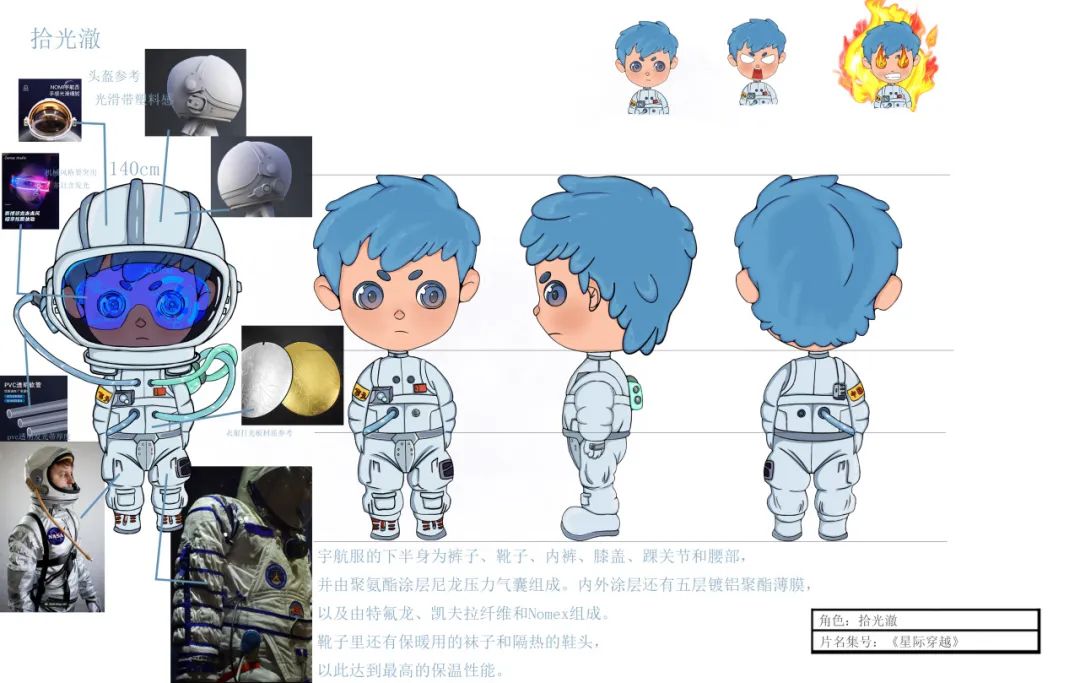 “拾光澈—神舟十三号航天文化IP形象”以中国航天文化为内容基础设计而成。当下神州十三号牵挂着民众的心绪,宇宙遥远的对岸是群众汇聚而成的文化符号的集合。文化特征以航天文化为文化输出,为热爱中国航天领域、渴望航天知识的人群打造一个多元化的星际穿越时空主题,普及文化的IP形象。通过航天元素组成当下流行的航天潮流独特的风格,以穿着太空服的小男孩形象,表达中国航天的文化意义,打造一个中国航天谱系之下的小男孩IP形象,创造一个符合当下大众审美和感兴趣的IP与链接更多的可能。