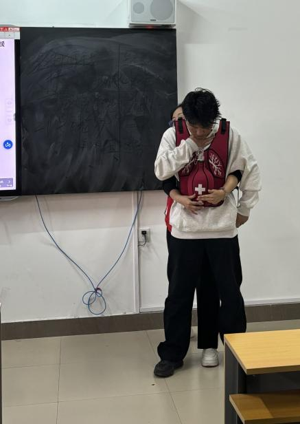 当天下午的培训中,纪老师详细讲解了应急救护的注意事项和心肺复苏的急救步骤,及时纠正学员的错误思想和不规范操作。她还亲身示范了胸外按压的方法,并与同学互动演示了背部叩击法和海姆利克急救法,现场学习氛围热烈,取得了良好效果。