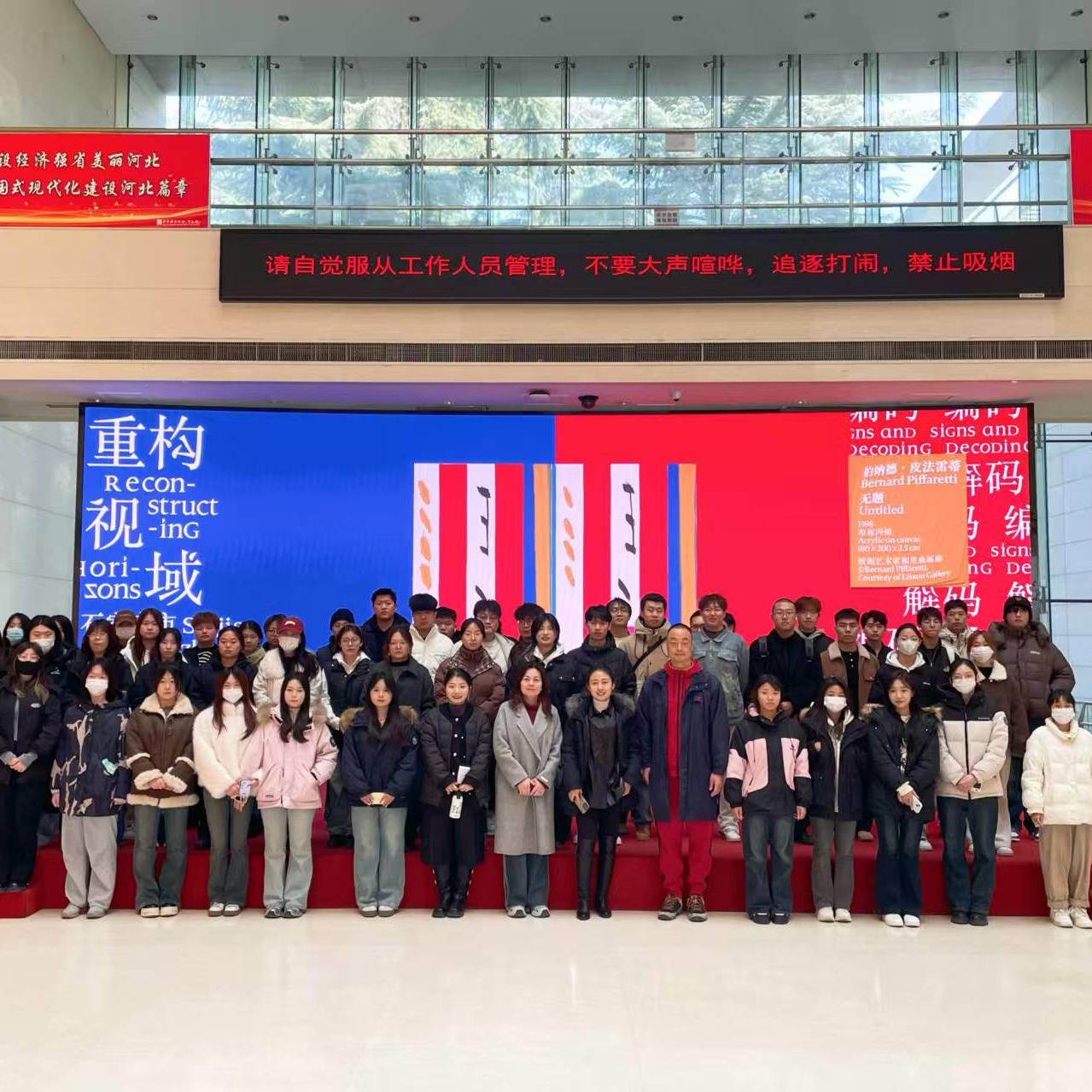 2025年2月25日上午,视觉传达设计系 2023级公共艺术设计专业70余名同学在我系副主任李凤和专业老师张彭云的带领下,前往石家庄市美术馆参加“重构视域”展览系列公教活动,开启《设计调研》课程首课。本次课程以“寻迹·造物”为主题,聚焦非遗与公共艺术的交融碰撞,此次观展活动旨在拓宽学生视野,了解当代艺术创作理念,为后续公共艺术设计奠定基础。